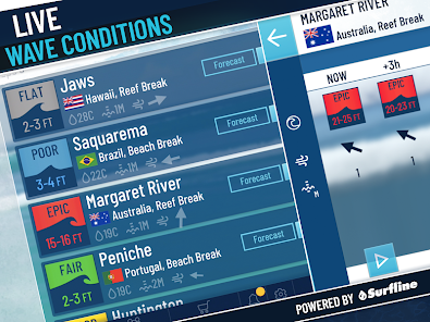 True Surf由Surfline海洋天氣預報專家的實時海浪預報數據提供支持。數據全天更新包括膨脹高度膨脹方向風潮汐和水溫。通過在您最喜愛的衝浪休息時間啟動“完美風暴”來加強電源。