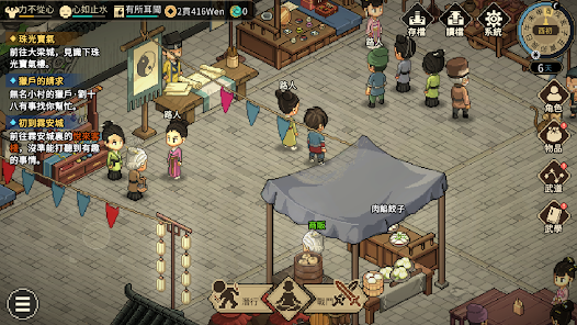 充滿煙火氣息的像素武俠世界。遊戲中有著自然流逝的時間各色NPC都有自己獨立的行為AI。